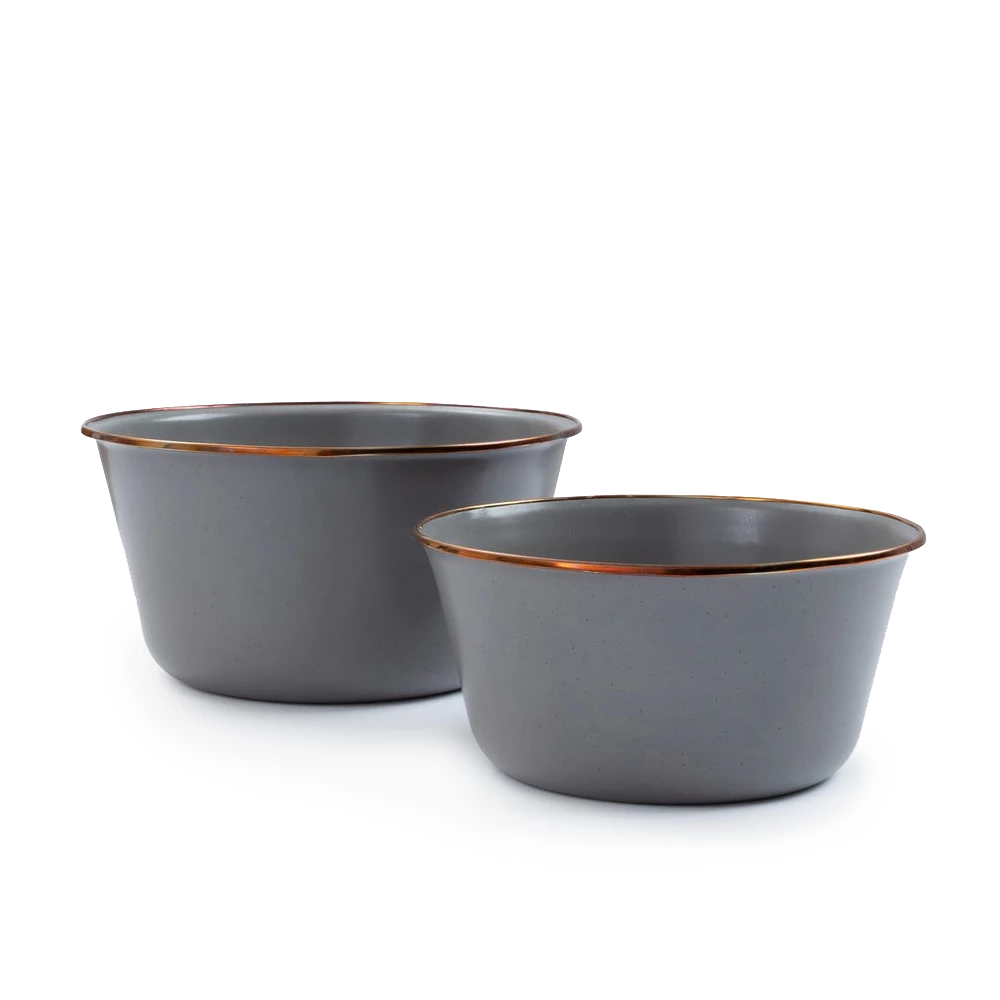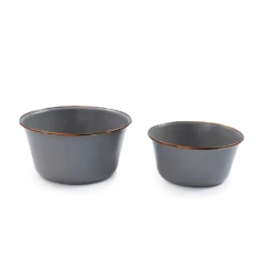 Process wet and dry ingredients to make all of your favorite sweets, breads, pastries, and more. Durable and sophisticated enough for both your camp kit and kitchen cooking, this Mixing Bowl Set features a hand-finished, baked stainless steel trim that creates a bronze-like patina finish. Lightweight and stackable.