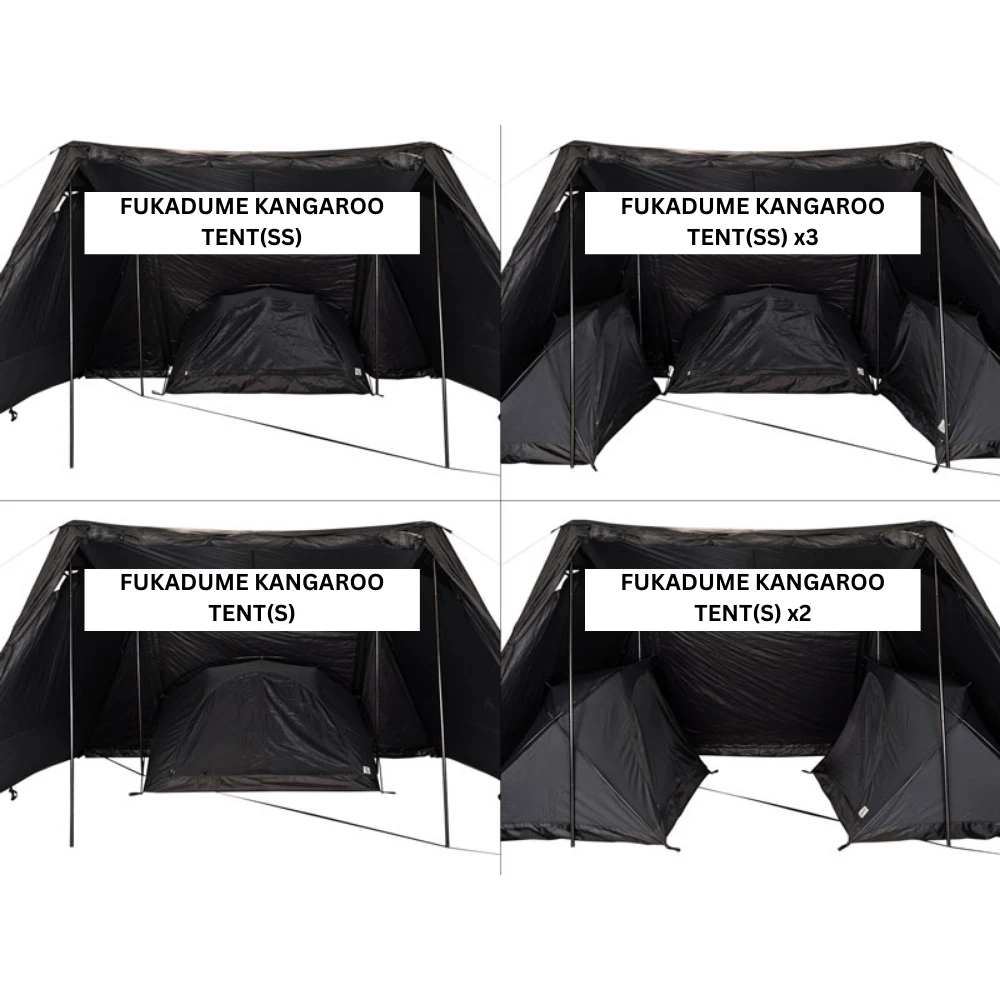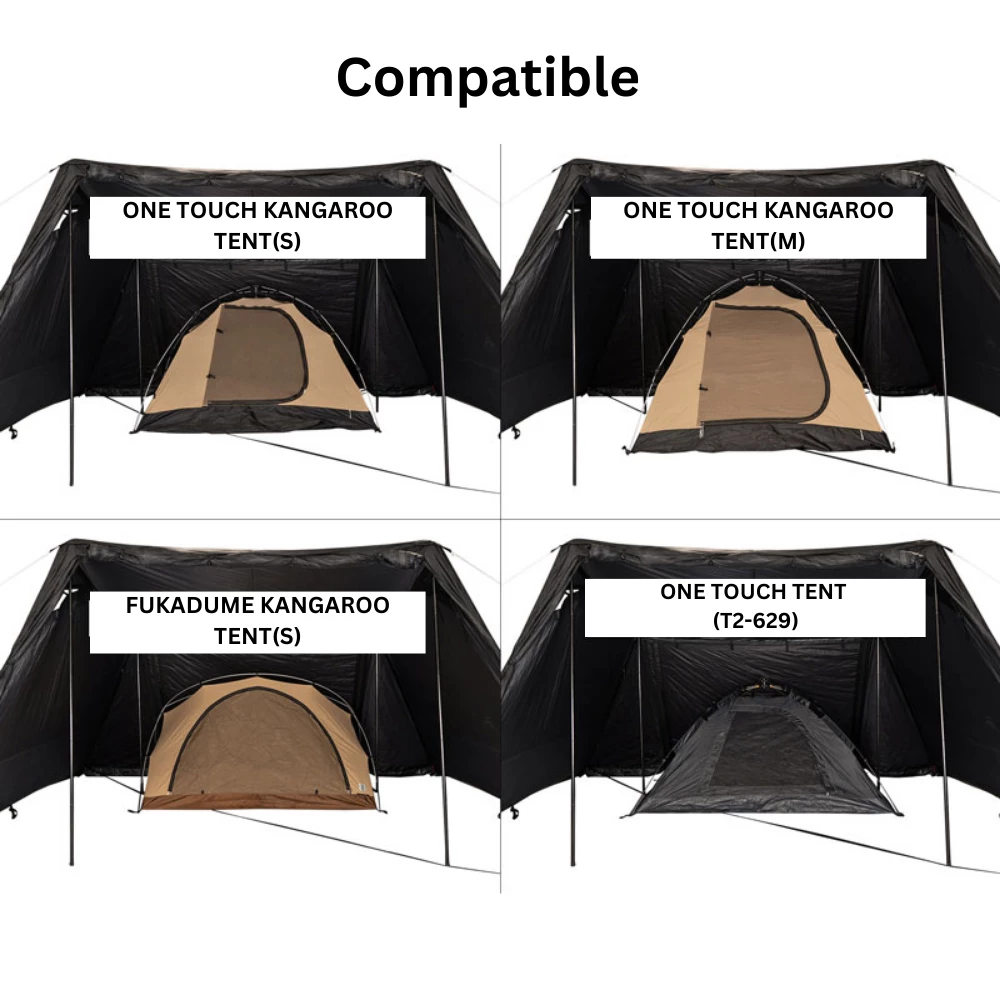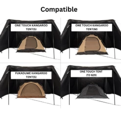 - What’s in the box: Tent fabric, sub pole x 2, main pole x 2, steel peg (black) x 8, nail peg x 6, rope (3m) x 3, rope (4m) x 2, Carry bag, tie belt x 2, carry bag (for poles), carry bag (for pegs) Attached to tent fabric