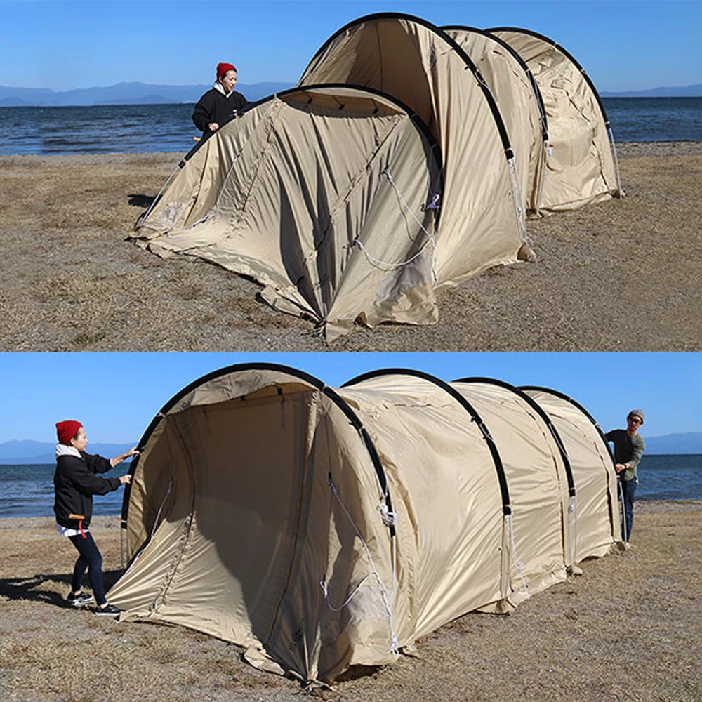 A two-room tunnel tent for all seasons, designed according to the climate unique to Japan and the size of the campsite. Kamaboko Tent 3L is a large size that is about 1.5 times the area of M size, and it can be used not only for group camps but also for family camps, and you can realize a spacious camp like glamping.