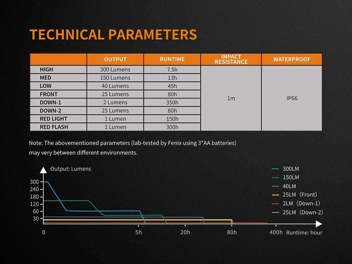 - Note: The abovementioned parameters (lab-tested by Fenix using three AA alkaline batteries) may vary between different environments.