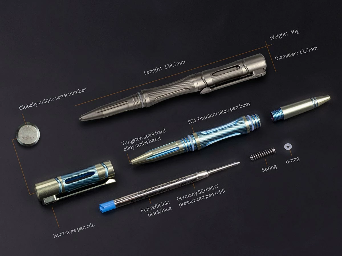 The Fenix Halberd T5Ti Titanium Tactical Pen is not only an exquisite writing instrument, but it’s also designed to be used in tactical situations. First and foremost, a tactical pen should be a great for writing, and with its German SCHMIDT® P950M pressurized refill, this pen performs this task perfectly—even underwater. The pen’s body is made of TC4 Titanium alloy with a hardened steel strike bezel which makes it strong enough to handle any emergency, self-defense, or tactical challenge. Lightweight with elaborate CNC machining, the Fenix Halberd T5Ti Titanium Tactical Pen will become your favorite pen to use every day or to give as a gift— even for the most discerning pen aficionado.