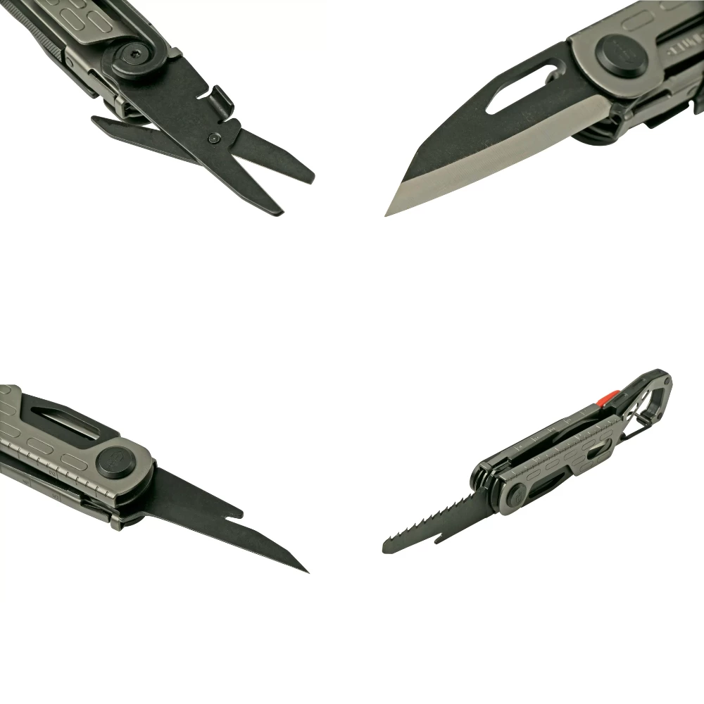 - Tools: awl, bottle opener, file, multi-purpose hook, knife, saw, scissors, scraper, tweezers, ruler, carabiner
