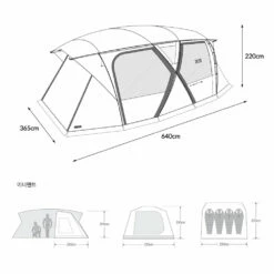 - Dimension: Upon installation – 640 x 365(H) x 220 CM | Storage – 80 x 35(H) x 35 CM | Inner tent – 330 x 220 x 200 (H) CM