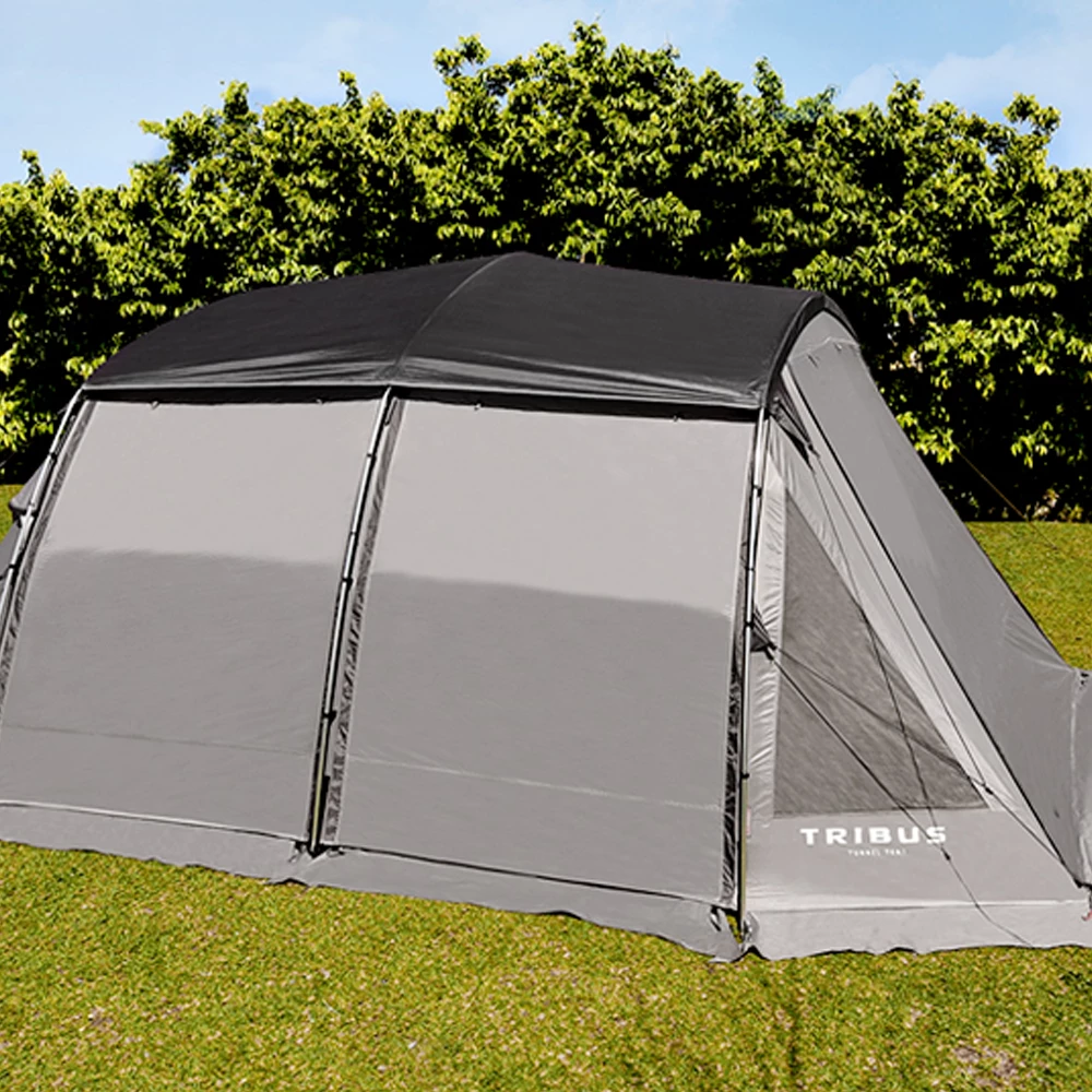 Tribus, a tunnel tent with three main poles for easy and quick installation,it shows a wide living room and inner tent, and performs wonderful open tent with a canopy type doors.