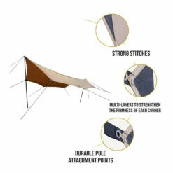 - Length: 400cm x 500cm | Storage: 58cm x 20cm x 20cm | Guy-line Length: 3m