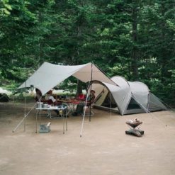 A tarp that blocks sunlight and creates shadows is essential for camping as a comfortable living space. That’s why in the Landnest series, we also developed a tarp that matches the Landnest Dome. The Land Nest Tarp is a hexagonal shape that is close to a rectangle, ensuring the maximum effective area while maintaining strength, and is characterized by creating a wide shadow. By laying out the tent entrance so that it overlaps the long side of the tarp, it is designed so that even the Medium size can fit in a general division site with plenty of room.