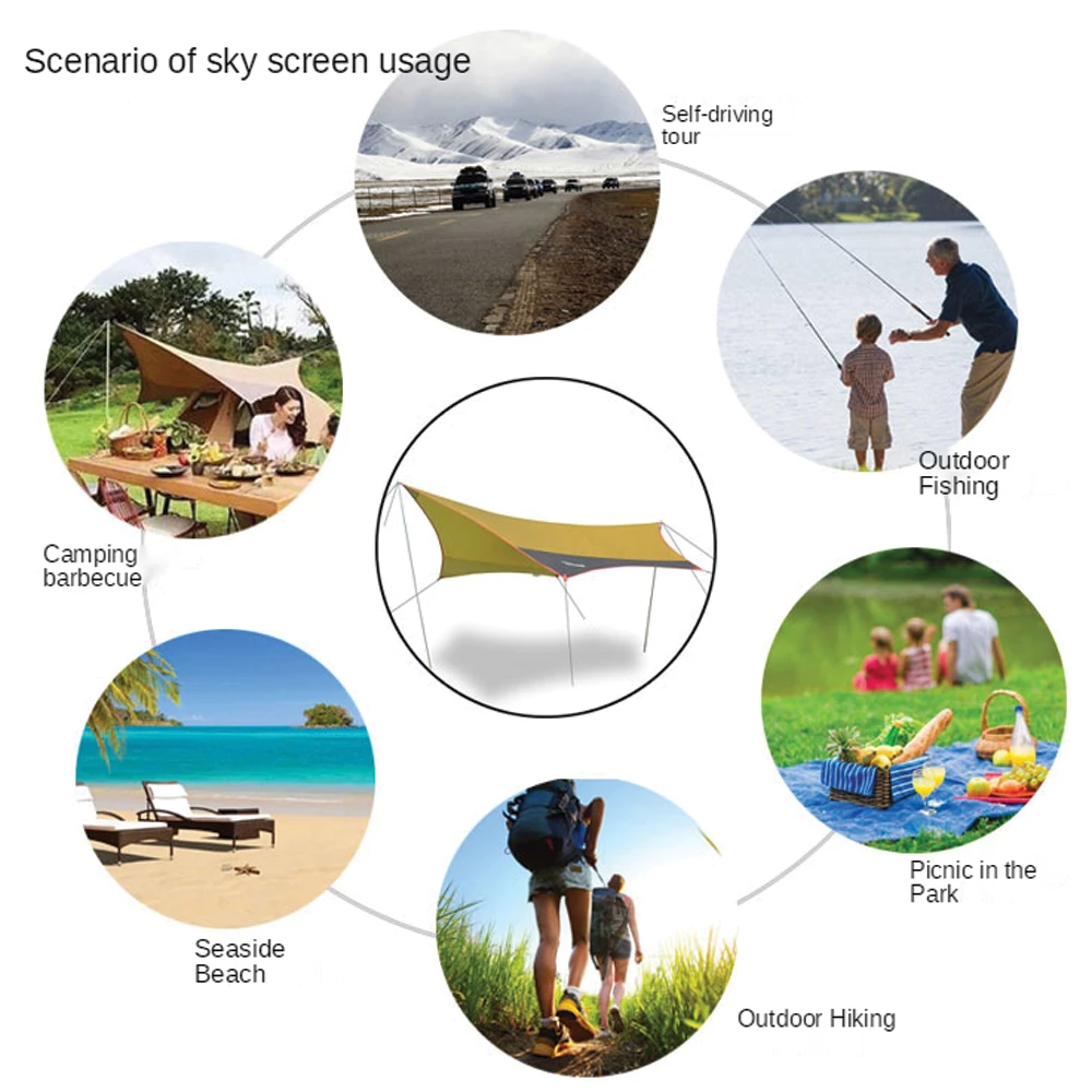 This premium tarp comes with a carry bag, complete accessories, pole, anchor, rope with adjuster, bag for ropes and anchors and poles and hammers.