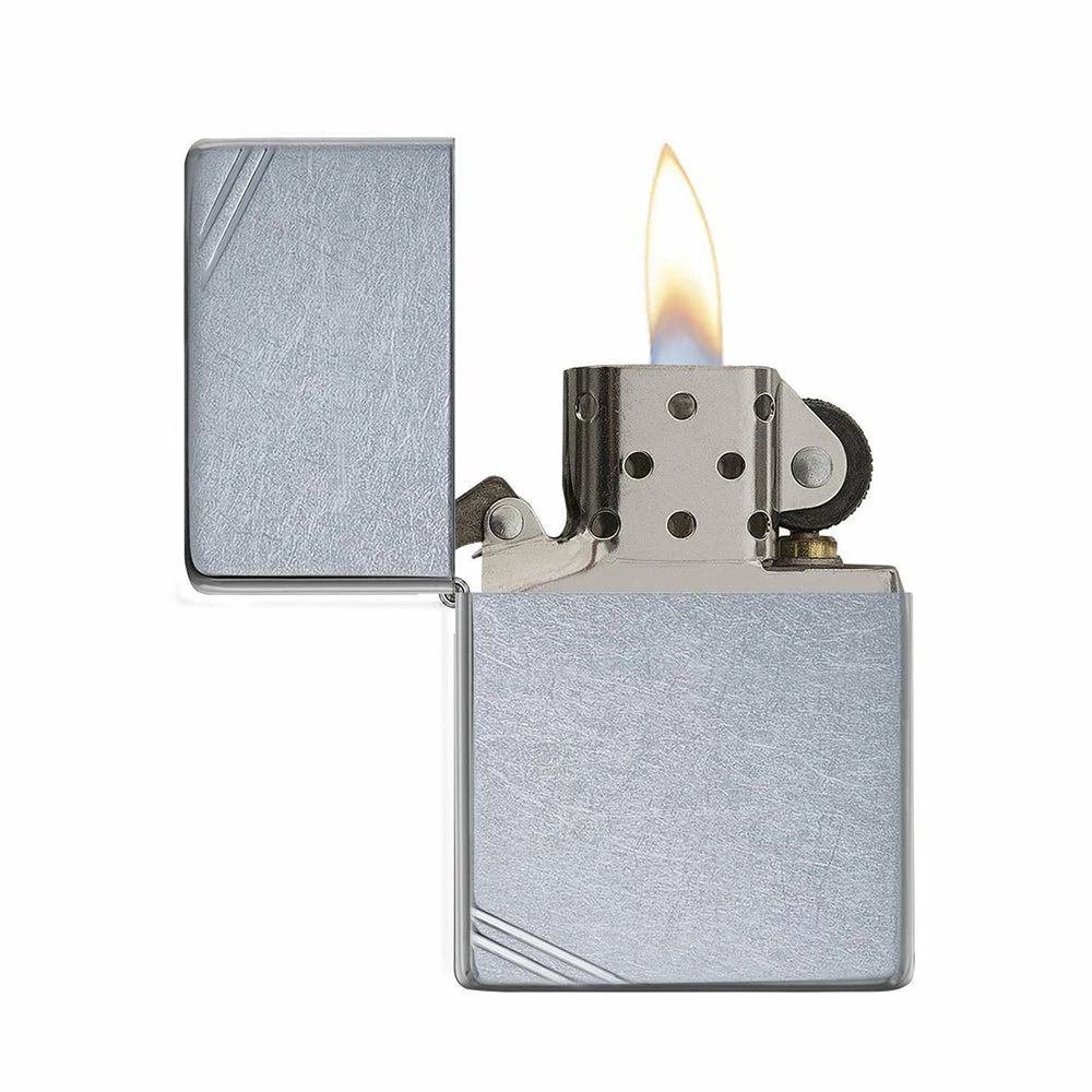 There’s nothing old about this vintage model. Features rounded corners and edges replacing the 1935 square case. This Street Chrome™ lighter features decorative slashes at the corners of this lighter. Comes packaged in a gift box. For optimal performance, fill with Zippo lighter fluid.